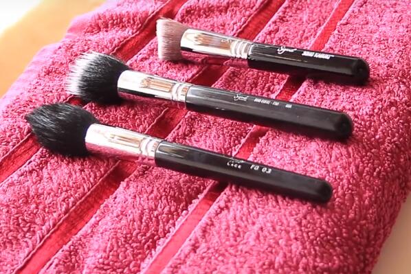 每次使用完刷子,在桌上鋪紙巾,將散粉或爽身粉撒在紙巾上,然后把化妝刷順著毛發的方向刷洗, 去除殘粉。一定要輕柔,直到刷子在干凈紙巾上再刷不出顏色為至。